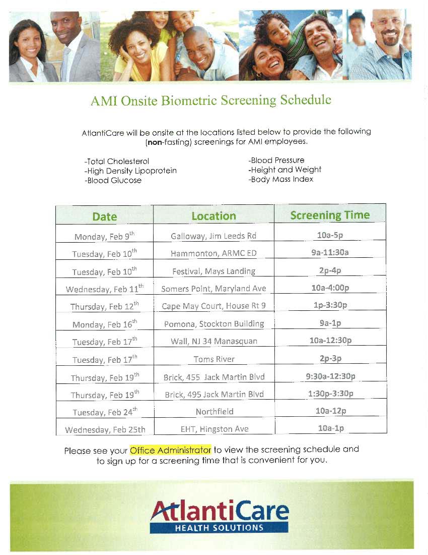 With the help of AtlantiCare, AMI will be providing Biometric Screening for all of our staff beginning on Monday, February 16th. A sign up sheet will be placed by the time clocks at each location (Pomona Staff, I'll put the sign up sheet on the kitchen door).