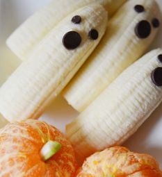 5. Enjoy Frozen Boo-nanas Cut bananas in half and add a popsicle stick at the bottom. Take a few chocolate chips and pop them into the banana halves to create eyes and mouths. Then, freeze them for a delicious, spooky dessert.