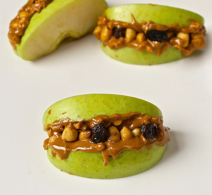 6. Try Spooky Monster Grills These Monster Grills are healthy, silly, and perfect for kids, and for you adults they are perfect after a workout for a boost of healthy protein and carbs. Slice apples into 12 equal pieces, and separate into 6 pairs. Spoon ½ Tbsp peanut butter onto each slice. Chop peanuts in half, & line half the apples w peanut halves. Place raisins at random interval between peanuts. Top off other apple half & serve.