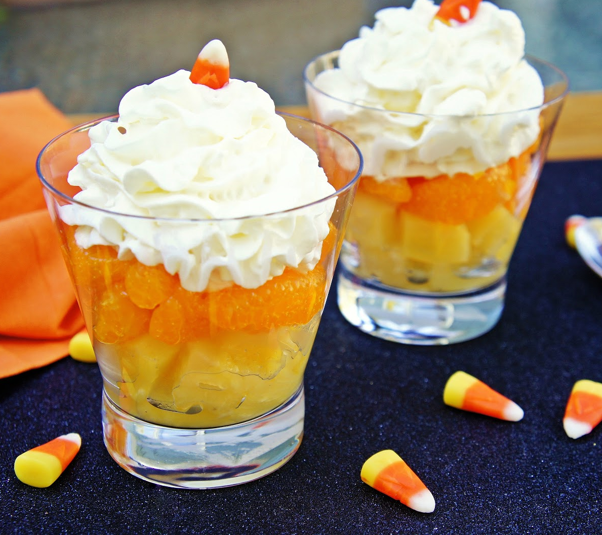 3. Serve Candy Corn Fruit Parfaits Candy Corn is delicious (I’m not here to lie to you, people!), but it’s not healthy—and it certainly doesn’t help kids learn about healthy foods. Make a candy corn-themed parfait instead! Fill a glass with a layer of tangerines, then a layer of pineapple, and top it with a dollop of whipped cream or coconut cream. Finish it off with an actual piece of candy corn (or three) for effect.